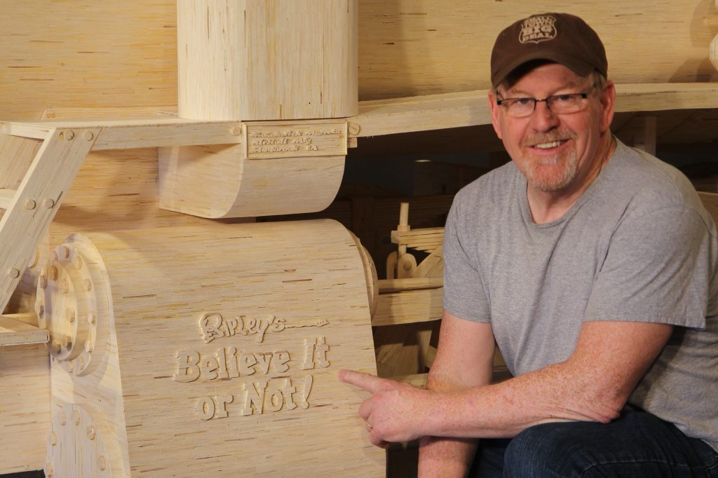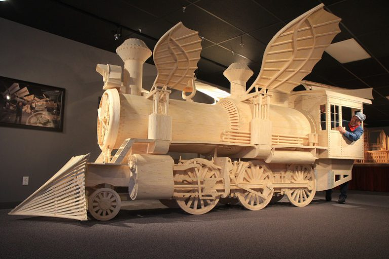 This model is Patrick Acton’s largest matchstick creation, containing over one million matchsticks and 35 gallons of wood glue, taking approximately 3000 hours to design and construct during the past 12 months. It measures over 20 feet long and 9 feet high, with a wingspan of 13 feet. The steampunk model is Pat’s own design, based loosely a 2-6-0 steam locomotive from the early 1900s and Leonardo da Vinci’s wing design from the 1500s. Plane Loco was completed in May of 2015.
